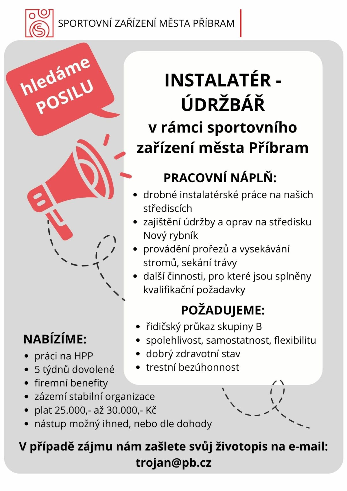 Hledáme posilu na pozici INSTALATÉR – ÚDRŽBÁŘ v rámci sportovního zařízení města Příbram