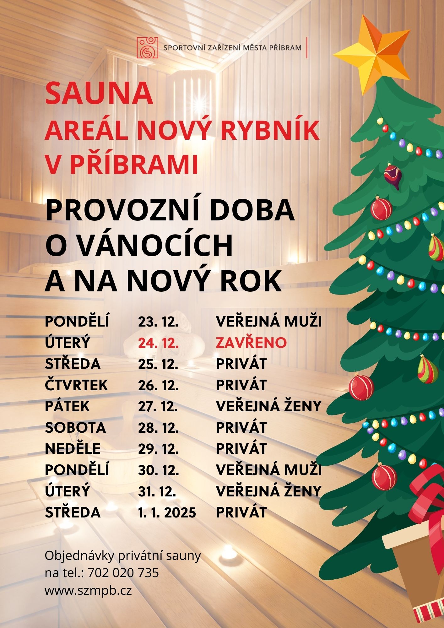 Zastavte se během svátků a užijte si chvíle klidu a regenerace v naší sauně. Ať už potřebujete vypotit cukroví, zahřát se v zimním období, nebo jen načerpat energii, naše sauna je tu pro vás.