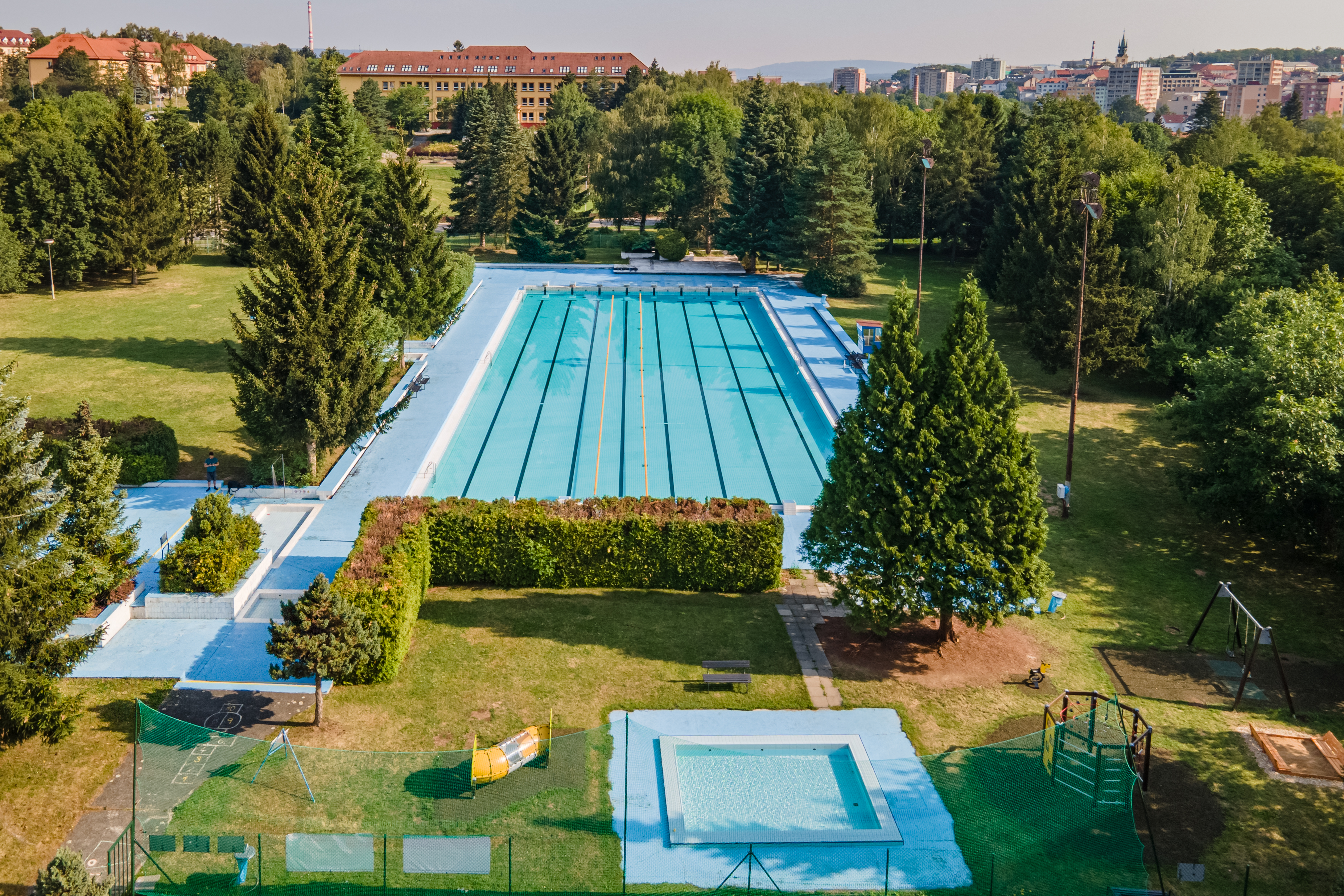 Bazén venkovního areálu je unikátní především svou velikostí. S rozměry 50 m x 20 m a hloubkou od 130 do 190 cm nabízí možnost si pořádně zaplavat. Areál je v provozu v závislosti na aktuálním počasí většinou od června do září a kromě osmi plaveckých drah nabízí také široké travnaté prostředí pro relax a odpočinek.